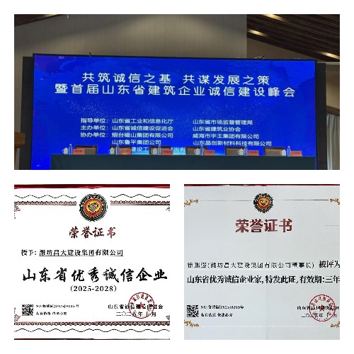 近日,由山東省誠信建設(shè)促進(jìn)會(huì)組織的“共筑誠信之基,共謀發(fā)展之策暨首屆山東省建筑企業(yè)誠信建設(shè)峰會(huì)”在山東煙臺(tái)隆重召開。會(huì)上,山東省誠信建設(shè)促進(jìn)會(huì)公布了首屆建筑業(yè)山東省優(yōu)秀誠信企業(yè)及優(yōu)秀誠信企業(yè)家”名單,集團(tuán)公司榮獲山東省優(yōu)秀誠信企業(yè)稱號(hào),董事長徐鵬強(qiáng)被評(píng)為山東省優(yōu)秀誠信企業(yè)家。